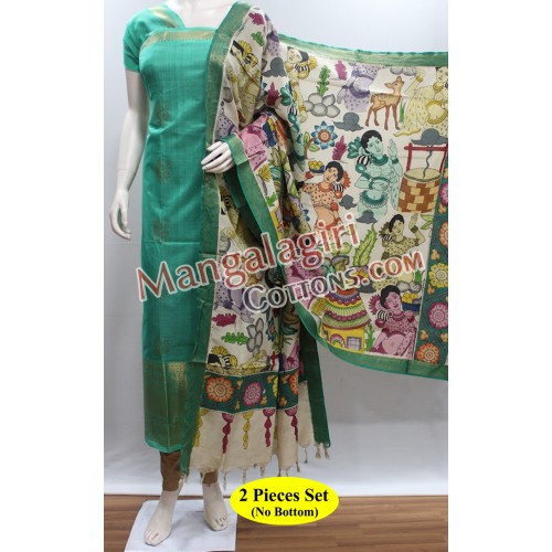 Mangalagiri Handloom Semi Pattu Butta Top with Gold Zari Border and Kalamkari HandPrint Dupatta With Nizam Border. Unstitched 2 Pieces Set.