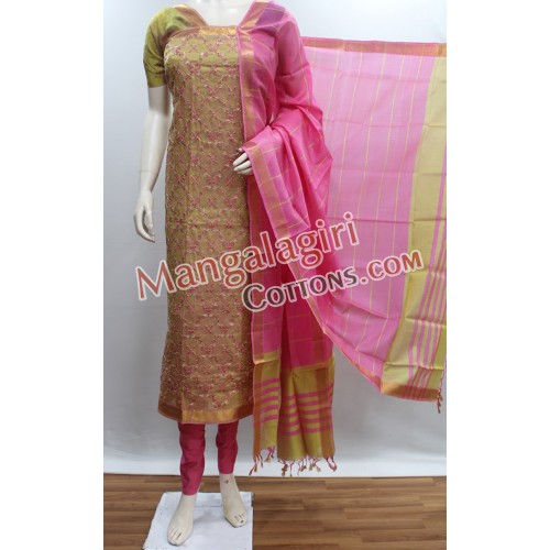 Mangalagiri Handloom Semi Pattu Dress Material with Gold Zari Border and Allover Zardosi work on Top Material. Unstitched 3 Pieces Set.