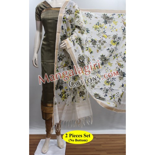 Mangalagiri Handloom Semi Pattu Top with Gold Zari Border and Semi Pattu Screen Print Dupatta. Unstitched 2 Pieces Set.