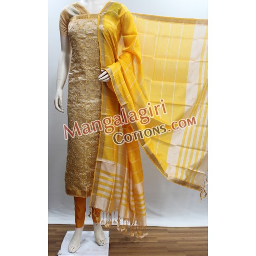 Mangalagiri Handloom Semi Pattu Dress Material with Gold Zari Border and Allover Zardosi work on Top Material. Unstitched 3 Pieces Set.