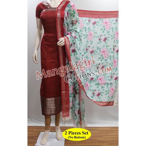 Mangalagiri Handloom Semi Pattu Top with Silver Zari Border and Semi Pattu Digital Print Dupatta. Unstitched 2 Pieces Set.