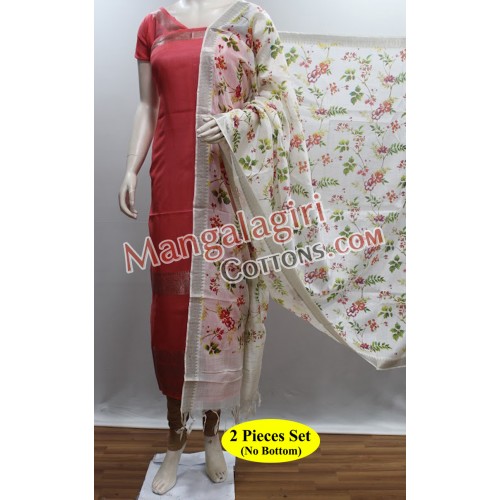 Mangalagiri Handloom Semi Pattu Top with Silver Zari Border and Semi Pattu Screen Print Dupatta. Unstitched 2 Pieces Set.