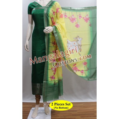 Mangalagiri Handloom Semi Pattu Top with Silver Zari Border and Semi Pattu Digital Print Dupatta. Unstitched 2 Pieces Set.