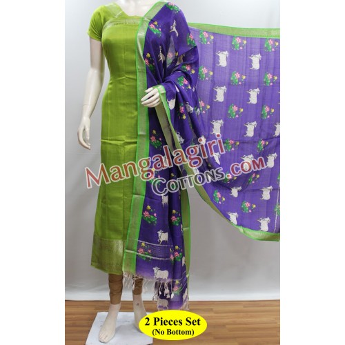 Mangalagiri Handloom Semi Pattu Top with Silver Zari Border and Semi Pattu Digital Print Dupatta. Unstitched 2 Pieces Set.