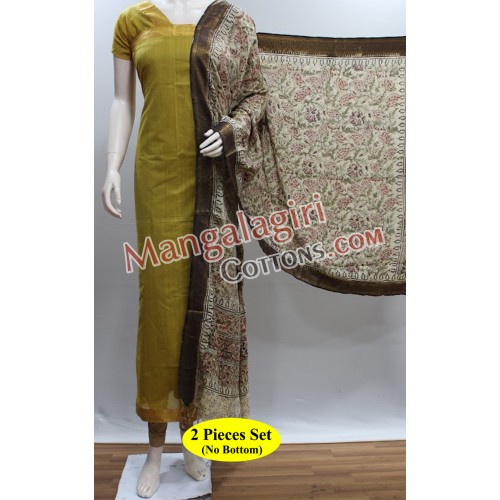 Mangalagiri Handloom Semi Pattu Nizam Border Top with Gold Zari Border and Semi Pattu Kalamkari Hand Block Print Dupatta. Unstitched 2 Pieces Set.