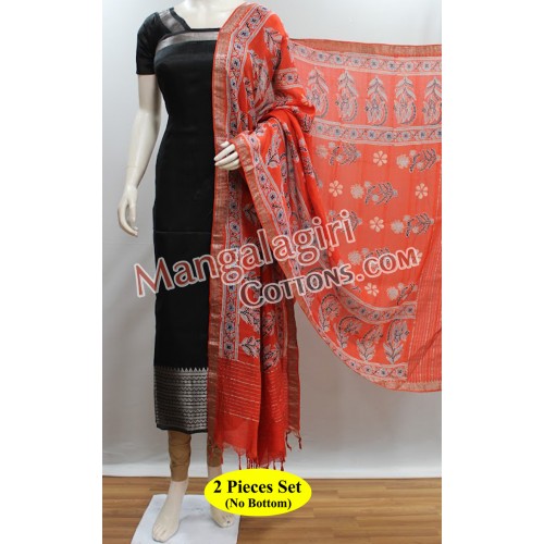Mangalagiri Handloom Semi Pattu Top with Silver Zari Border and Semi Pattu Ajrakh Print Dupatta. Unstitched 2 Pieces Set.