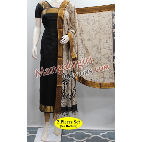 Mangalagiri Handloom Semipattu Top with Gold Zari Border. Kalamkari Nizam Border Dupatta. Unstitched 2 Pieces Set.
