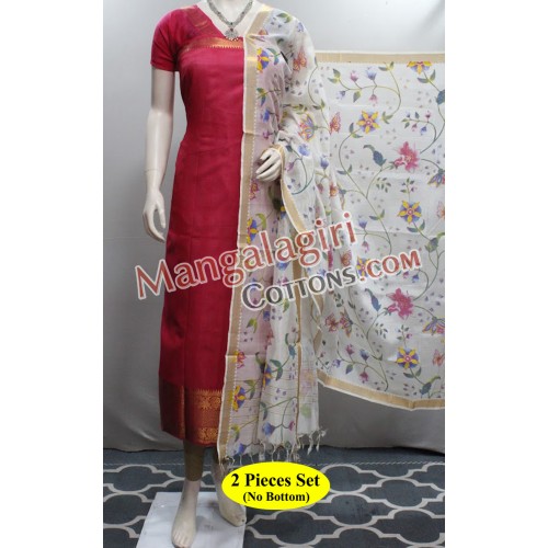 Mangalagiri Handloom Semi Pattu Top with Gold Zari Border and Semi Pattu Screen Print Dupatta. Unstitched 2 Pieces Set.