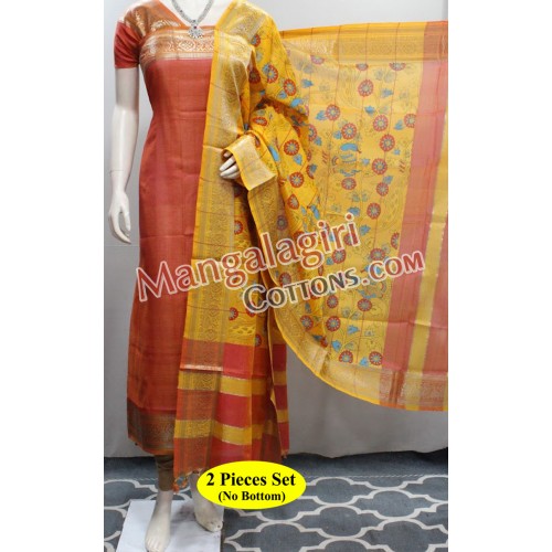 Mangalagiri Handloom Semi Pattu Top with Silver Zari Border and Semi Pattu Screen Print Dupatta. Unstitched 2 Pieces Set.