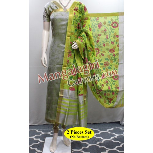 Mangalagiri Handloom Semi Pattu Top with Gold Zari Border and Semi Pattu Screen Print Dupatta. Unstitched 2 Pieces Set.
