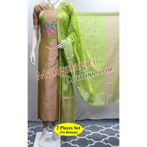Mangalagiri Handloom Semi Pattu kanchi Screen Print Dress Material with Silver Zari Border. Unstitched 2 Pieces Set.