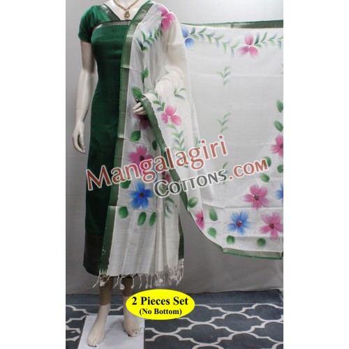 Mangalagiri Handloom Semi Pattu Top with Silver Zari Border and Semi Pattu Hand Paint Dupatta. Unstitched 2 Pieces Set.