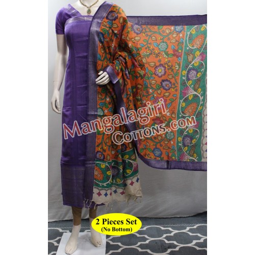 Mangalagiri Handloom Semi Pattu Top with Silver Zari Border and Semi Pattu Hand Paint Pen Kalamkari Dupatta. Unstitched 2 Pieces Set.