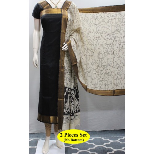Mangalagiri Handloom Semipattu Nizam Top with Gold Zari Border. With Kalamkari Nizam Border Dupatta. Unstitched 2 Pieces Set.