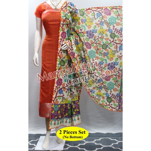 Mangalagiri Handloom Semipattu Top with Silver Zari Kanchi Border. Semipattu Pen Kalamkari Hand Paint Dupatta With Cut Work Border . Unstitched 2 Pieces Set.