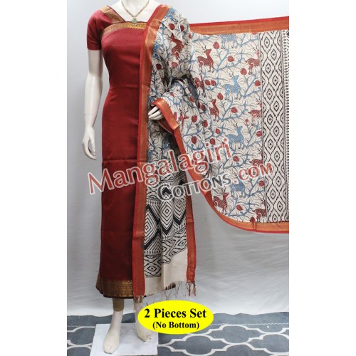 Powerloom Semipattu Top with Gold Zari Border. With Kalamkari Hand Painted Semipattu Dupatta. Unstitched 2 Pieces Set.
