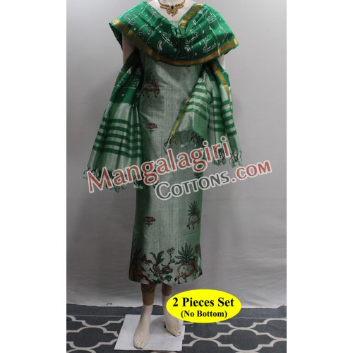 Mangalagiri Handloom Semi Pattu Screen Print Top with Gold Zari Border and Semi Pattu Screen Print Dupatta. Unstitched 2 Pieces Set.