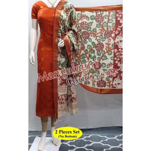 Mangalagiri Powerloom Rawsilk Top Kalamkari Nizam Border Screen Print Dupatta. Unstitched 2 Pieces Set.
