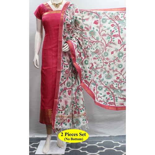 Mangalagiri Handloom Semi Pattu Top with Gold Zari Kanchi Border and Semi Pattu Screen Print Dupatta. Unstitched 2 Pieces Set.