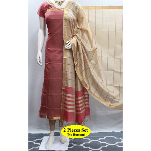 Mangalagiri Handloom Semi Pattu Dress Material with Gold Zari Border. Unstitched 2 Pieces Set.