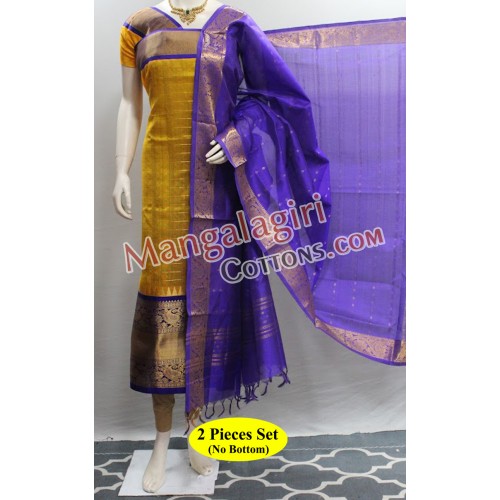 Mangalagiri Handloom Pure Pattu Dress Material with Gold Zari Kanchi Border. Unstitched 2 Pieces Set.