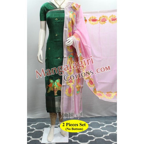 Mangalagiri Handloom Semi Pattu Tanjore Print Top with Silver Zari Border and Semi Pattu Tanjore Print Dupatta. Unstitched 2 Pieces Set.