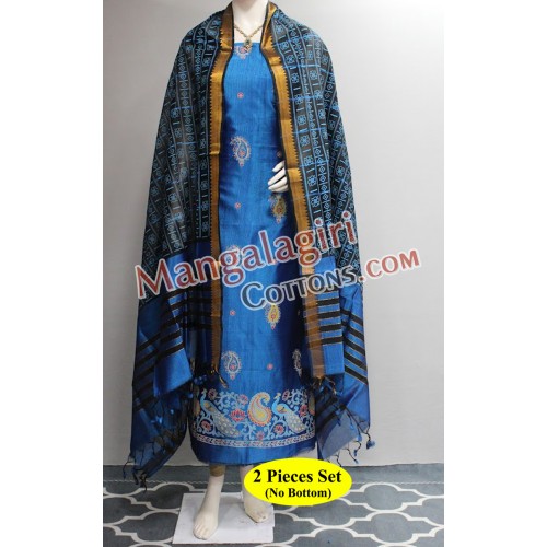 Mangalagiri Handloom Semi Pattu Screen print Top with Gold Zari Border and Semi Pattu Screen Print Dupatta. Unstitched 2 Pieces Set.
