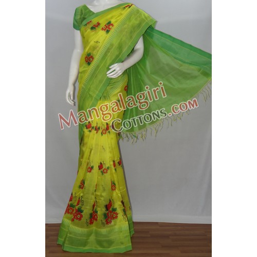 Printed Mangalagiri SemiPattu Saree (Cotton+SemiPattu Mix) with Cotton Border. Saree comes with unstiched blouse piece. Weaving pattern: Semi thick weaving. Saree Length:6.2 to 6.4 meters (Which include blouse piece)