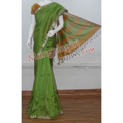 Mangalagiri SemiPattu Saree (Cotton+SemiPattu Mix) with Zari Border. Saree comes with unstiched blouse piece. Weaving pattern:Semi thick weaving. Saree Length:6.2 to 6.4 meters(Which include blouse piece)