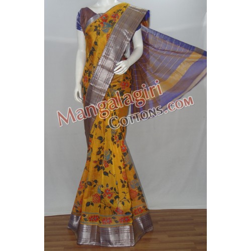 Printed Mangalagiri Pattu Saree (Cotton+Pattu Mix) with Zari Border. Saree comes with unstiched blouse piece. Weaving pattern:Semi thick weaving. Saree Length:6.2 to 6.4 meters(Which include blouse piece)