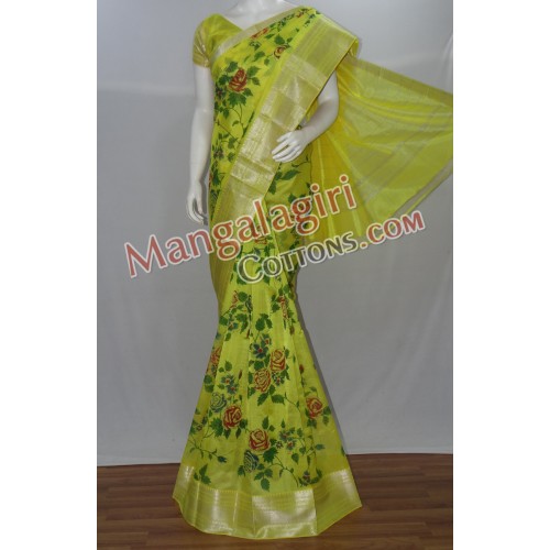Printed Mangalagiri Pattu Saree (Cotton+Pattu Mix) with Zari Border. Saree comes with unstiched blouse piece. Weaving pattern:Semi thick weaving. Saree Length:6.2 to 6.4 meters(Which include blouse piece)