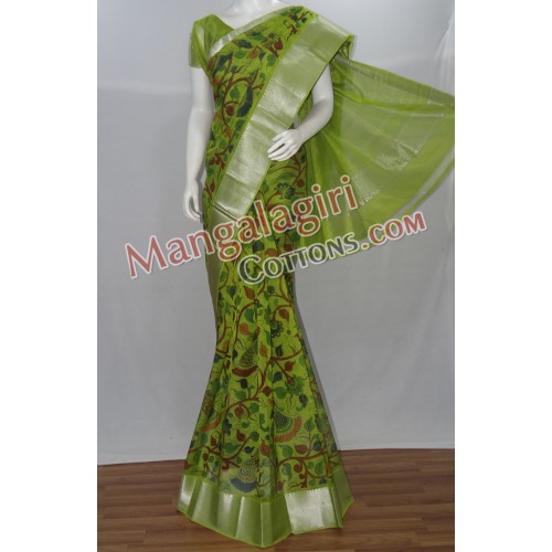 Printed Mangalagiri Pattu Saree (Cotton+Pattu Mix) with Zari Border. Saree comes with unstiched blouse piece. Weaving pattern:Semi thick weaving. Saree Length:6.2 to 6.4 meters(Which include blouse piece)