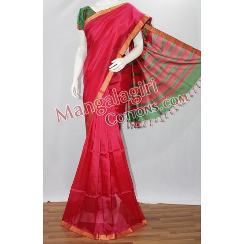 Mangalagiri SemiPattu Saree (Cotton+SemiPattu Mix) with Zari Border. Saree comes with unstiched blouse piece. Weaving pattern:Semi thick weaving. Saree Length:6.2 to 6.4 meters(Which include blouse piece)
