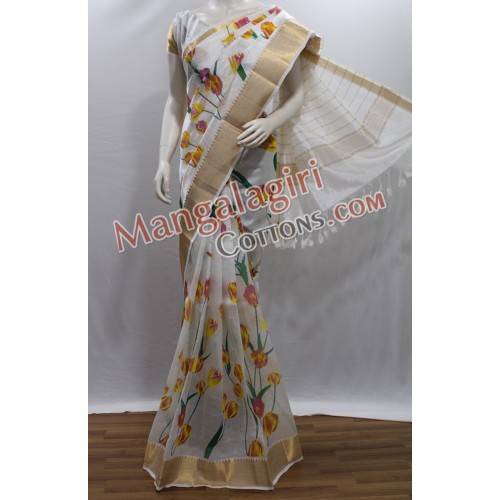 Printed Mangalagiri SemiPattu Saree (Cotton+SemiPattu Mix) with Zari Border. Saree comes with unstiched blouse piece. Weaving pattern:Semi thick weaving. Saree Length:6.2 to 6.4 meters(Which include blouse piece)