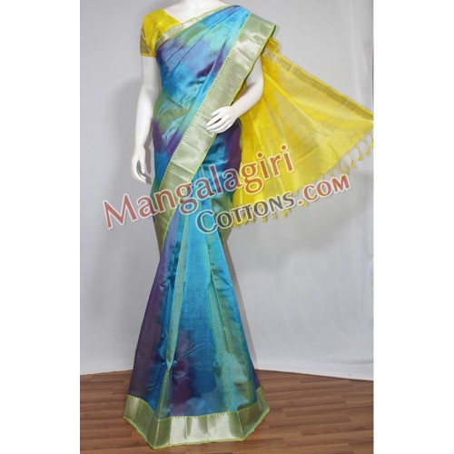 Mangalagiri SemiPattu Ikkat Saree (Cotton+SemiPattu Mix) with Zari Border. Saree comes with unstiched blouse piece. Weaving pattern:Semi thick weaving. Saree Length:6.2 to 6.4 meters(Which include blouse piece)