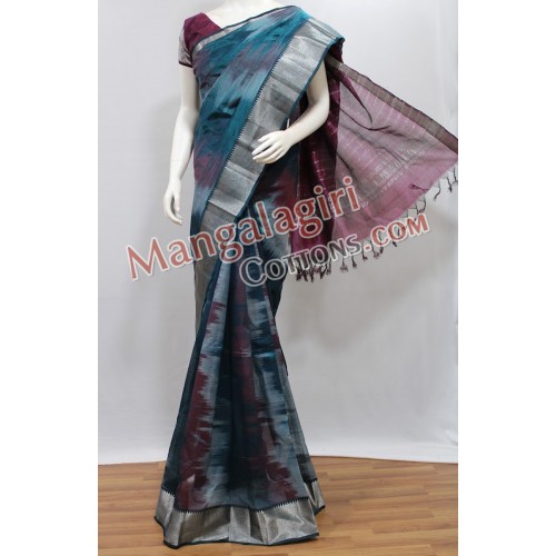 Mangalagiri SemiPattu Ikkat Saree (Cotton+SemiPattu Mix) with Zari Border. Saree comes with unstiched blouse piece. Weaving pattern:Semi thick weaving. Saree Length:6.2 to 6.4 meters(Which include blouse piece)