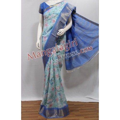 Digital Print Mangalagiri SemiPattu Saree (Cotton+SemiPattu Mix) with Zari Border. Saree comes with unstiched blouse piece. Weaving pattern:Semi thick weaving. Saree Length:6.2 to 6.4 meters(Which include blouse piece)
