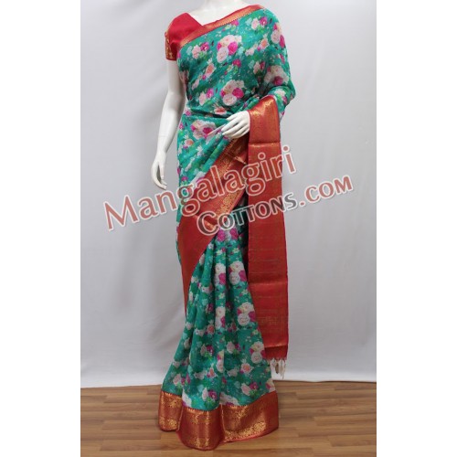 Digital Print Mangalagiri SemiPattu Saree (Cotton+SemiPattu Mix) with Zari Border. Saree comes with unstiched blouse piece. Weaving pattern:Semi thick weaving. Saree Length:6.2 to 6.4 meters(Which include blouse piece)