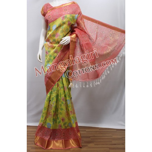 Digital Print Mangalagiri SemiPattu Saree (Cotton+SemiPattu Mix) with Zari Border. Saree comes with unstiched blouse piece. Weaving pattern:Semi thick weaving. Saree Length:6.2 to 6.4 meters(Which include blouse piece)