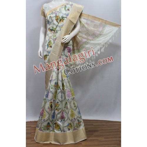 Mangalagiri Powerloom Semi Pattu Printed Saree (Cotton Warp +Semi Pattu Weaving) with Gold zari Border.Saree comes with Unstitched Blouse Piece.