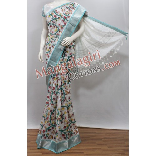 Mangalagiri Handloom Semi Pattu Printed Saree (Cotton Warp +Semi Pattu Weaving) with Silver Zari Border. Saree comes with Unstitched Blouse Piece.