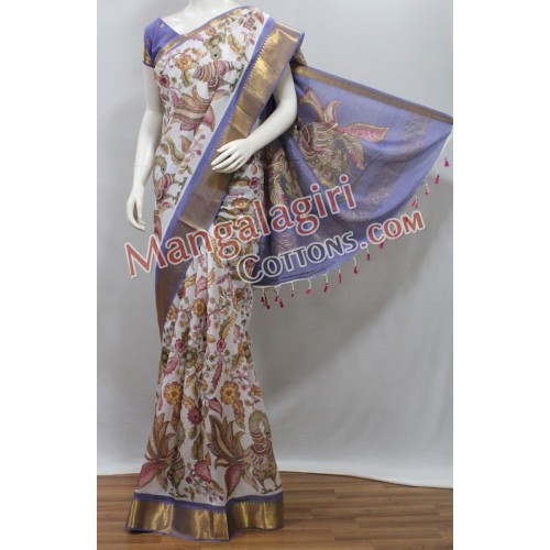 Mangalagiri Handloom Semi Pattu Printed Saree (Cotton Warp +Semi Pattu Weaving) with Gold Zari Border. Saree comes with Unstitched Blouse Piece.