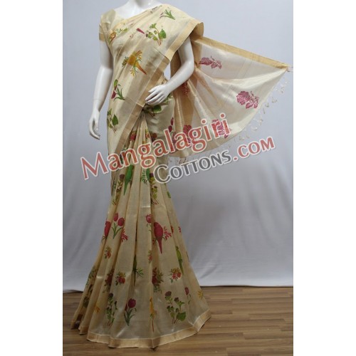 Mangalagiri Handloom Semi Pattu Printed Saree (Cotton Warp +Semi Pattu Weaving) with Gold Zari Border.Saree comes with Unstitched Blouse Piece.