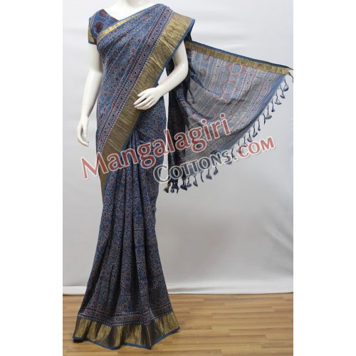 Mangalagiri Handloom Semi Pattu Printed Saree (Cotton Warp +Semi Pattu Weaving) with Silver Zari Border.Saree comes with Unstitched Blouse Piece.