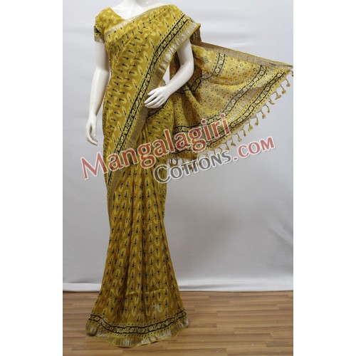 Mangalagiri Handloom Semi Pattu Printed Saree (Cotton Warp +Semi Pattu Weaving) with Silver Zari Border.Saree comes with Unstitched Blouse Piece.