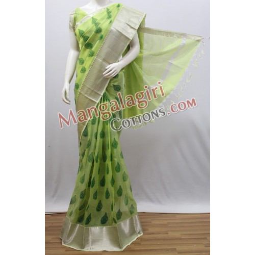 Mangalagiri Handloom Semi Pattu Printed Saree (Cotton Warp +Semi Pattu Weaving) with Silver Zari Border.Saree comes with Unstitched Blouse Piece.