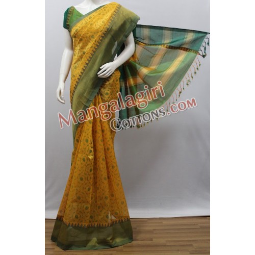 Mangalagiri Handloom Semi Pattu Printed Saree (Cotton Warp +Semi Pattu Weaving) with Cotton Border.Saree comes with Unstitched Blouse Piece.