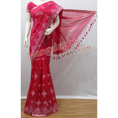 Mangalagiri Handloom Semi Pattu Printed Saree (Cotton Warp +Semi Pattu Weaving) with Silver Zari Border.Saree comes with Unstitched Blouse Piece.