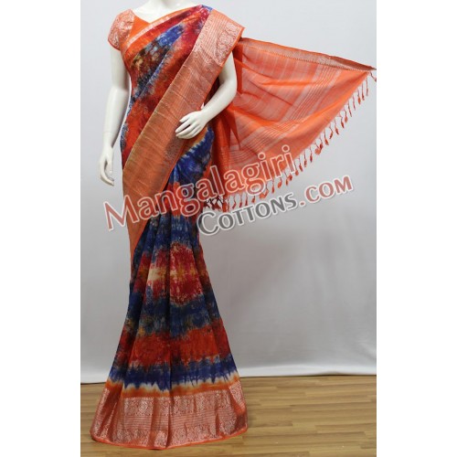 Mangalagiri Handloom Semi Pattu Printed Saree (Cotton Warp + Semi Pattu Weaving) with Silver Zari Border.Saree comes with Unstitched Blouse Piece.
