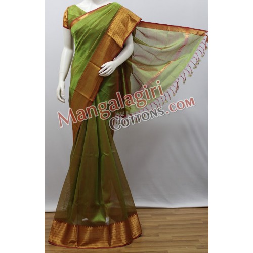 Mangalagiri Handloom Semi Pattu Saree (Cotton Warp + Semi Pattu Weaving) with Gold Zari Border. Saree comes with Unstitched Blouse Piece.